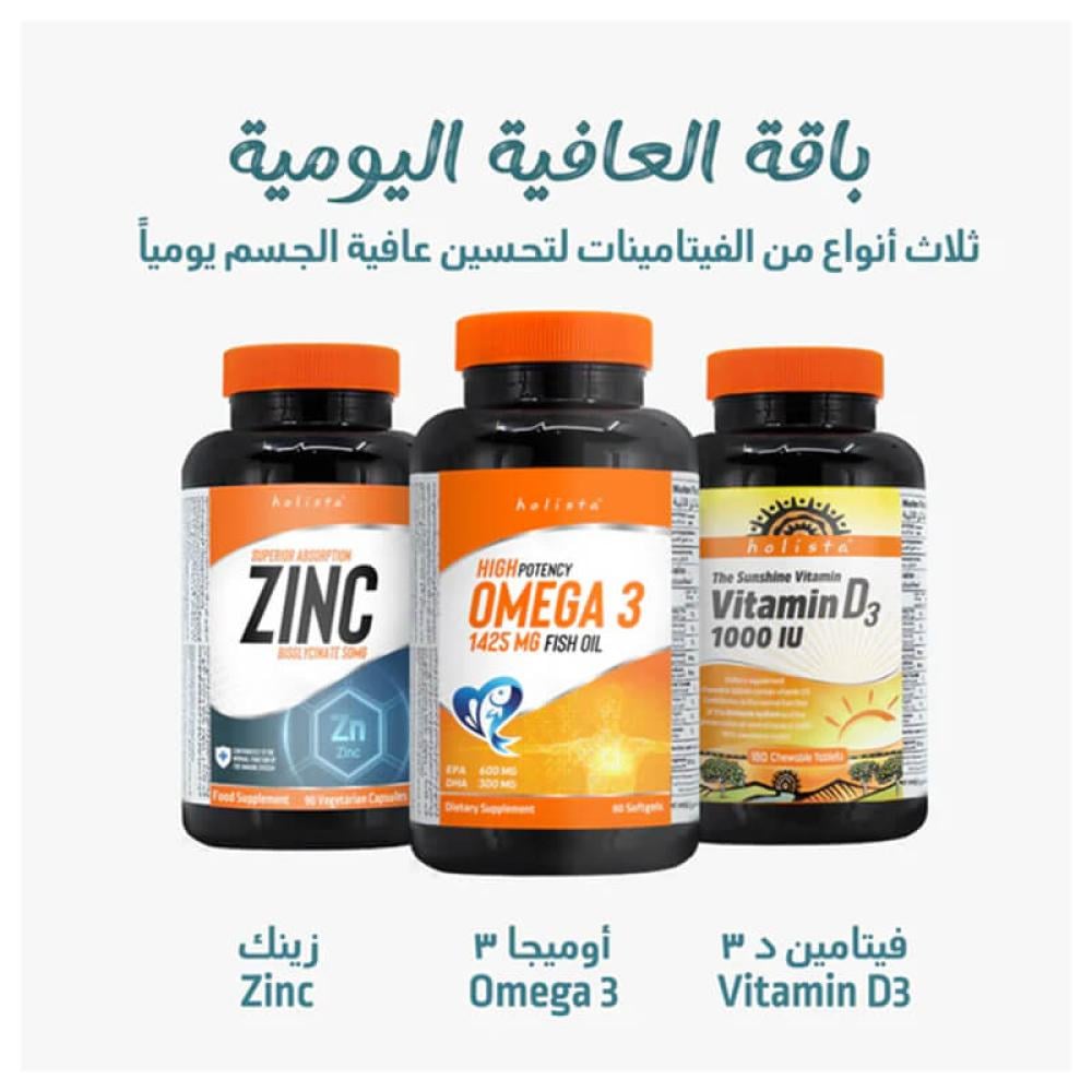 تتكون مجموعة الصحة والعافية اليومية من ثلاث مكملات غذائية فعّالة لتحسين عافية الجسم يوميًا، وتشمل: