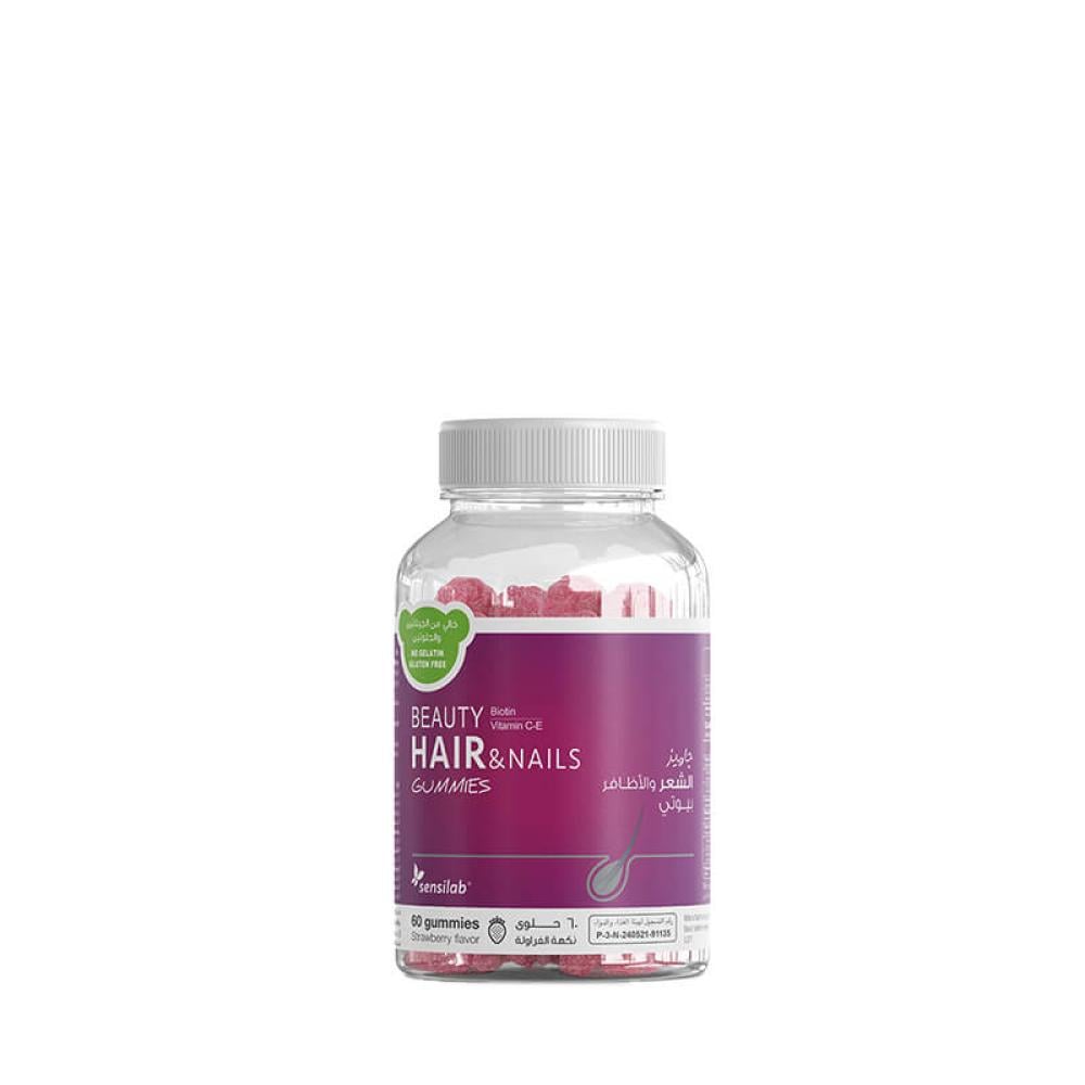 منتج تكميلي يهدف إلى تعزيز صحة الشعر والأظافر. يحتوي هذا المنتج على تركيبة غنية بالفيتامينات والمعادن المهمة للشعر والأظافر القوية والصحية. تحتوي الحلوى على مجموعة متنوعة من الفيتامينات مثل (البيوتين) وفيتامين سي وفيتامين هـ. يعتبر البيوتين مهمًا لصحة الشعر والأظافر، حيث يساعد في تعزيز نموهما وتقويتهما. بينما يساهم فيتامين سي في تعزيز إنتاج الكولاجين، الذي يعزز صحة الأظافر والشعر ويعزز قوتهما. أما فيتامين هـ، فهو مضاد للأكسدة ويساهم في تحسين صحة فروة الرأس وتعزيز نمو الشعر.